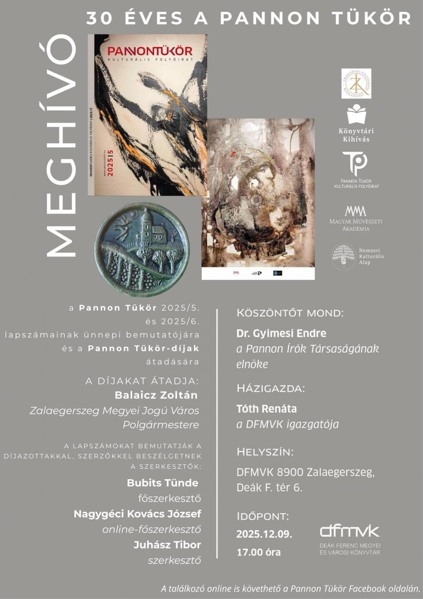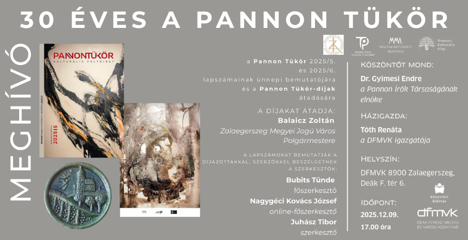 A Pannon Tükör kulturális folyóirat 30-ik évfordulóját a Pannon Tükör-díjak átadásával fogja ünnepelni December 9-én! A legfrissebb számok is ünnepi bemutatóra kerülnek az este folyamán. Sok szeretettel várunk minden érdeklődőt!