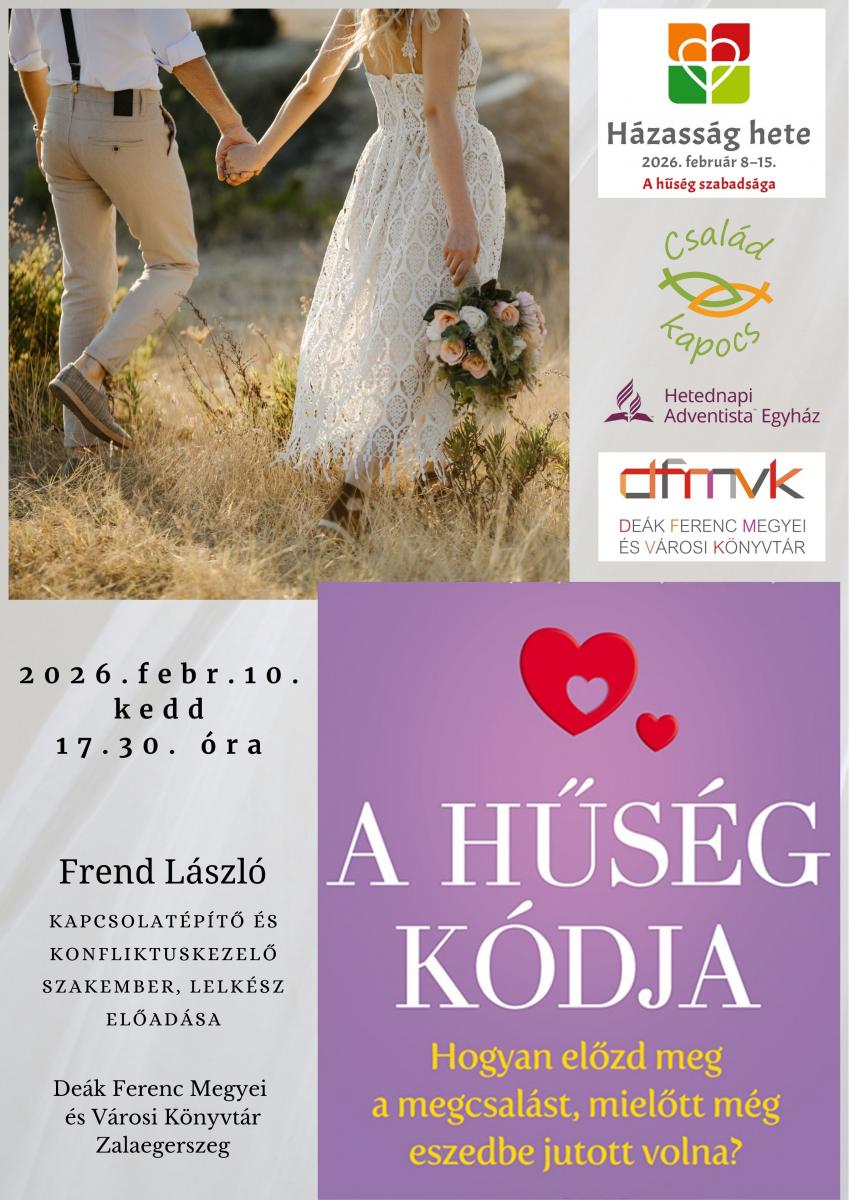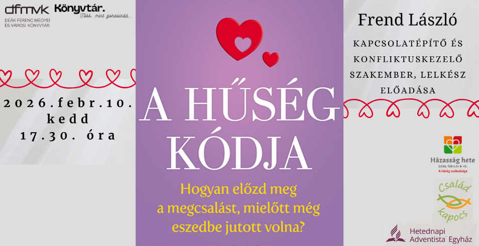 Február 10-én a Házasság Hete alkalmából, könyvtárunk helyszínt ad Frend László kapcsolatépítő és konfliktuskezelő szakembernek, hogy megtartsa "A Hűség Kódja" című előadását! Sok szeretettel várunk minden érdeklődőt!