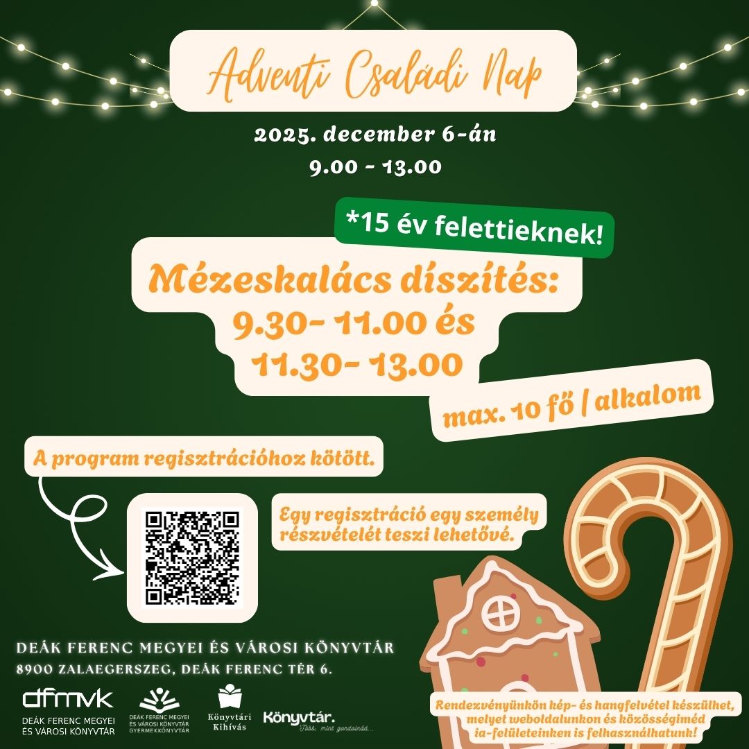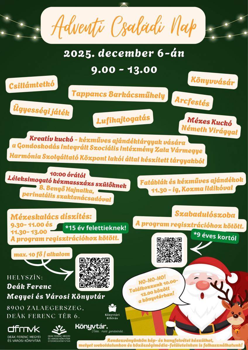Sok szeretettel meghívunk mindenkit a Deák Ferenc Megyei és Város Könyvtár idei Adventi Családi Nap ünnepségére! December 6-án sok izgalmas, karácsonyi varázslattal teli programmal várjuk az érdeklődőket, kicsiket és nagyokat egyaránt! Látogassanak el az egész családdal!