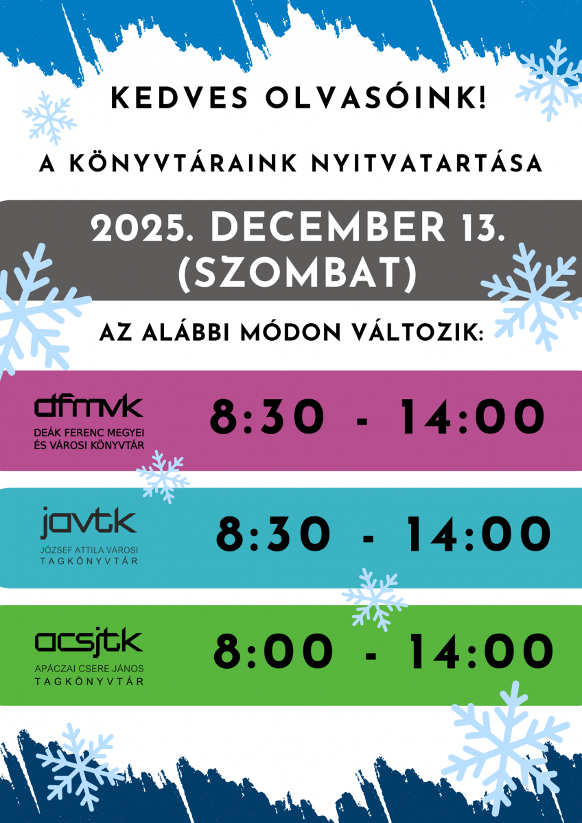 Figyelem! Könyvtáraink nyitvatartása a plakáton jelzett módón változik! Várjuk szeretettel olvasóinkat!![]()