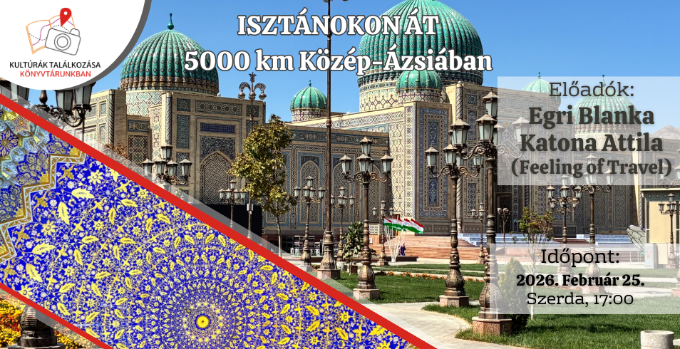 A Kultúrák találkozása könyvtárunkban programsorozat következő állomásán Egri Blanka és Katona Attila (Feeling of Travel) tart élménybeszámolóval egybekötött úti előadást Közép-Ázsiáról. Az „Isztánokon át” című vetített képes előadás egy 5000 kilométeres utazás történetét, kultúráit és különleges helyszíneit mutatja be.