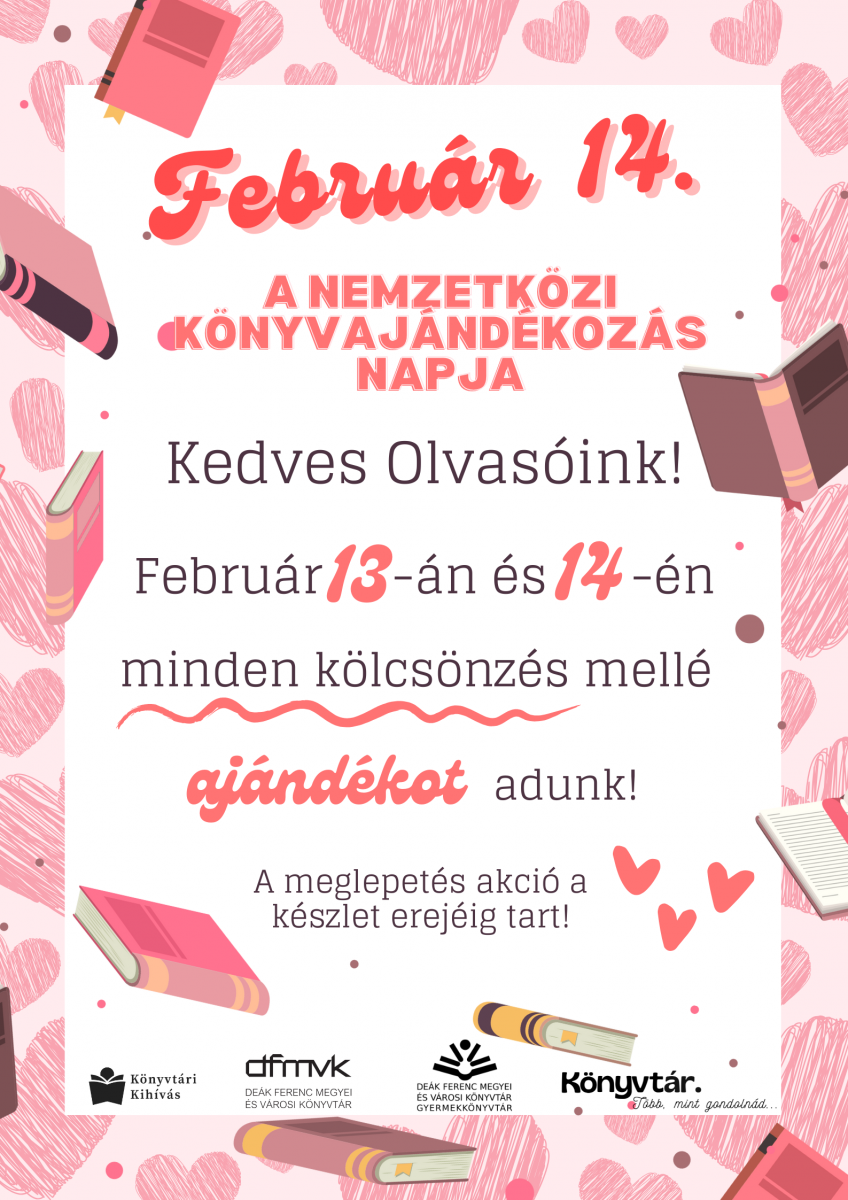 Ünnepeljük együtt a Nemzetközi Könyvajándékozás Napját! Február 13-án és 14-én minden kölcsönző olvasónk ajándékban részesül! A meglepetés a készlet erejéig tart!