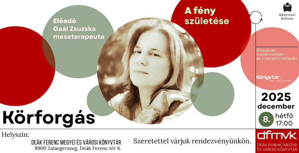 Egy újabb Körforgás programra invitáljuk Önöket December 8-án!! Gaál Zsuzska meseterapeuta ezúttal "A fény születése" címmel fog interaktív előadást tartani. A program a mesék erejével segít rálátni életünk ismétlődő mintáira, és új kapcsolódási lehetőségeket kínál. Sok szeretettel várunk minden érdeklődőt!