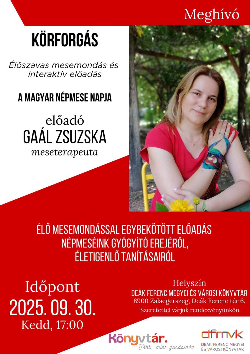 szeptember 30-án különleges program várja az érdeklődőket a Deák Ferenc Megyei és Városi Könyvtárban, Zalaegerszegen. Az esemény a magyar népmese napja alkalmából kerül megrendezésre, amely során a közönség megtapasztalhatja, hogyan segíthetnek a mesék az önismeretben, a gyógyulásban és a mindennapi élet kihívásainak megértésében.