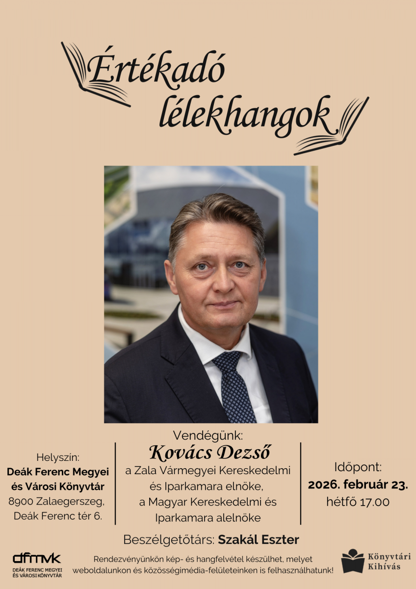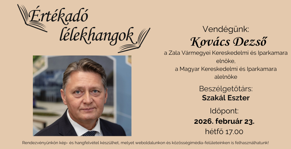 Értékadó lélekhangok című programsorozatunk következő vendége Kovács Dezső, a Zala Vármegyei Kereskedelmi és Iparkamara elnöke, a Magyar Kereskedelmi és Iparkamara alelnöke lesz. Vele életéről, pályájáról, a könyvekhez és az olvasáshoz való viszonyáról beszélgetünk majd.