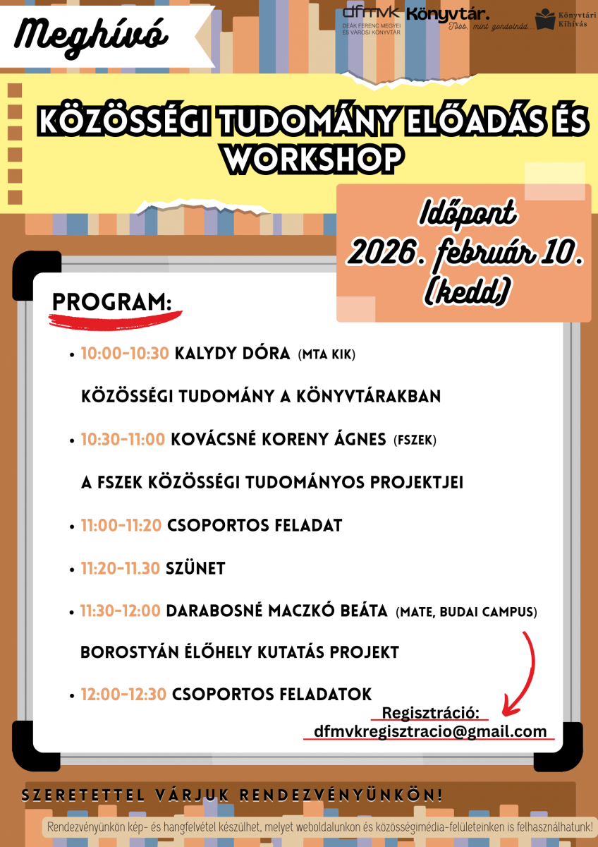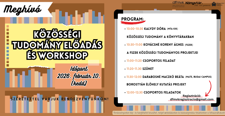 Február 10-én könyvtárunk helyszínt ad a Közösségi Tudomány előadás és workshop című programnak! A rendezvény folyamán meghívottaink különféle témákon keresztül mutatják be, hogy mit is jelent a közösségi tudomány.