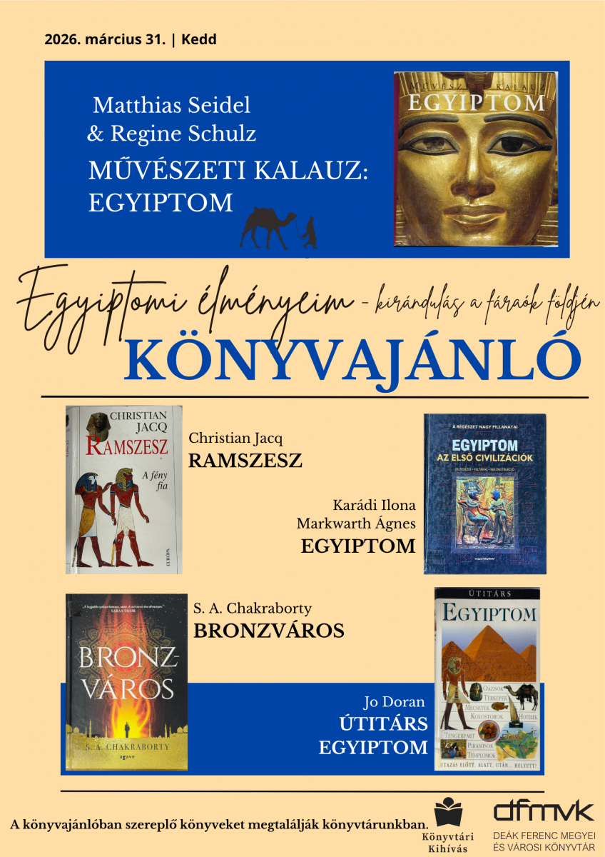 A Kultúrák Találkozása Könyvtárunkban programsorozat következő állomásán ezúttal Egyiptomba „utazunk." Egy izgalmas előadás során bepillantást nyerhetünk a titkokkal és mítoszokkal átszőtt egyiptomi világba: megismerhetjük az ott élők mindennapjait, szokásait, ételeit és hitvilágát.