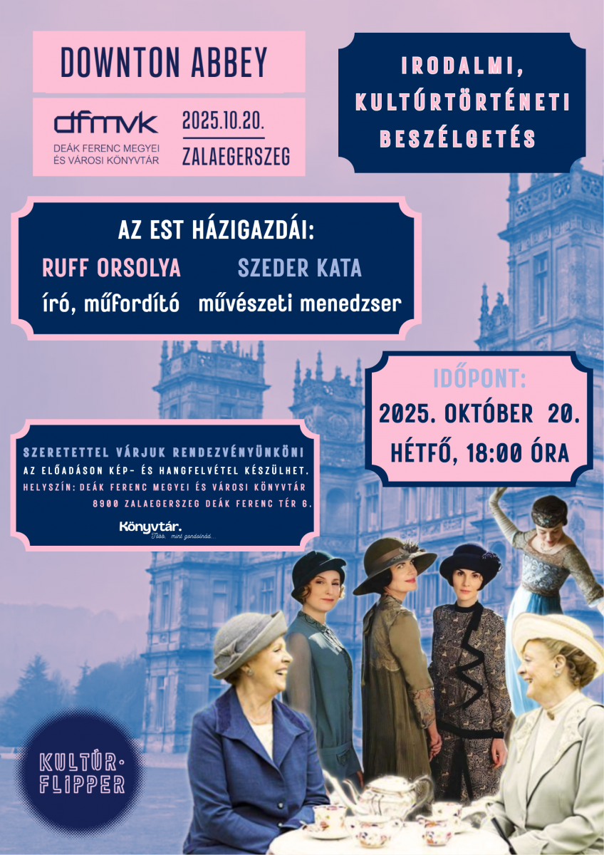 Október 20-án, Hétfőn, 18 órakor izgalmas rendezvényre invitáljuk Önöket! Eljött a következő Kultúrflipper irodalmi és kultúrtörténeti beszélgetés! Ruff Orsolya és Szeder Kata ez alkalommal a híres és szeretett Downtown Abbey-ről fog előadást tartani.