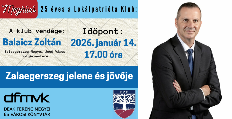 A jubileumát ünneplő Lokálpatrióta Klub vendége Balaicz Zoltán, Zalaegerszeg Megyei Jogú Város polgármestere. A beszélgetés középpontjában Zalaegerszeg jelene és jövője áll. A program beszélgetőtársa Iványi Ildikó klubvezető.