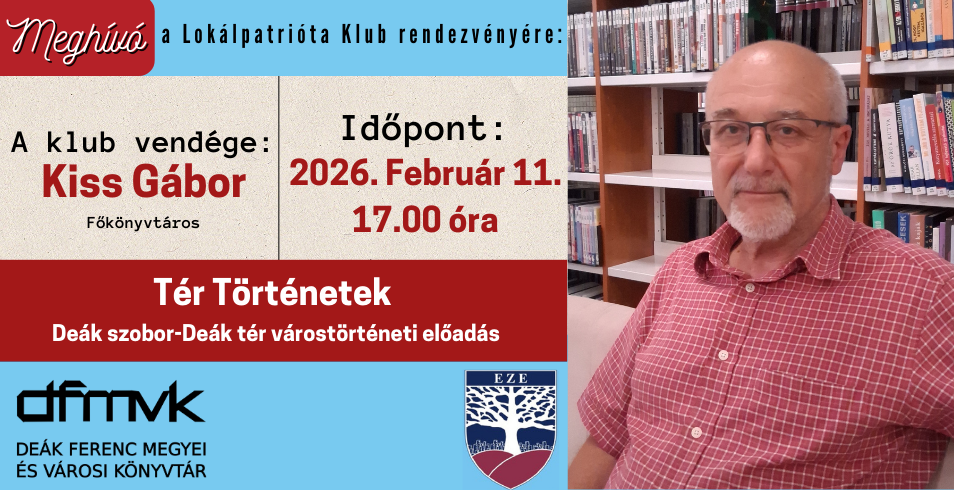 A Lokálpatrióta Klub rendezvényén ezúttal Kiss Gábor főkönyvtáros tart várostörténeti előadást Tér Történetek címmel, amely a Deák szobor és a Deák tér történetét mutatja be. Az esemény ingyenes, minden érdeklődőt szeretettel várunk a Deák Ferenc Megyei és Városi Könyvtárba.