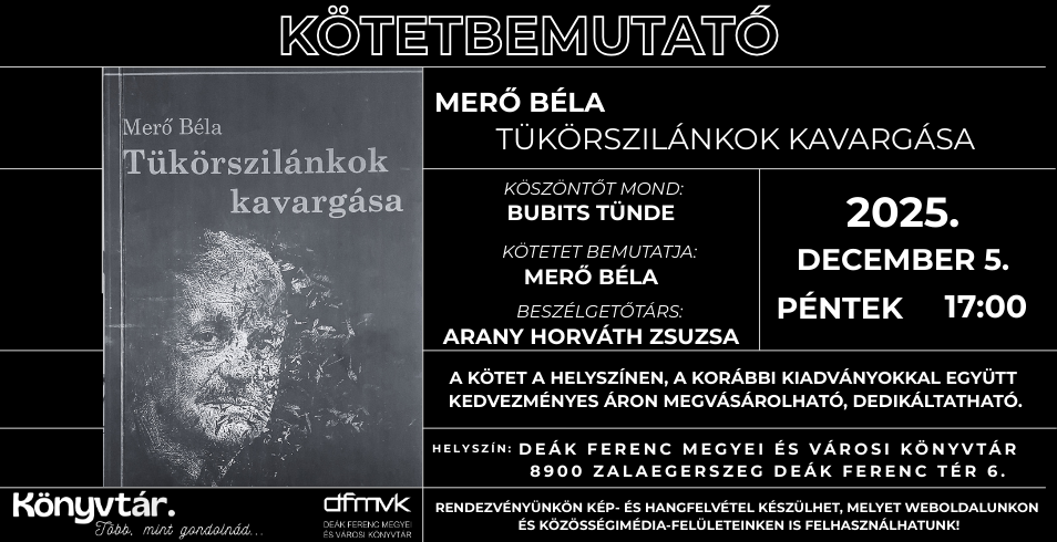 A Deák Ferenc Megyei és Városi Könyvtár szeretettel vár minden érdeklődőt Merő Béla új kötetének bemutatójára. A rendezvényen köszöntőt mond Bubits Tünde, a kötetet bemutatja a szerző, a beszélgetőtárs pedig Arany Horváth Zsuzsa.