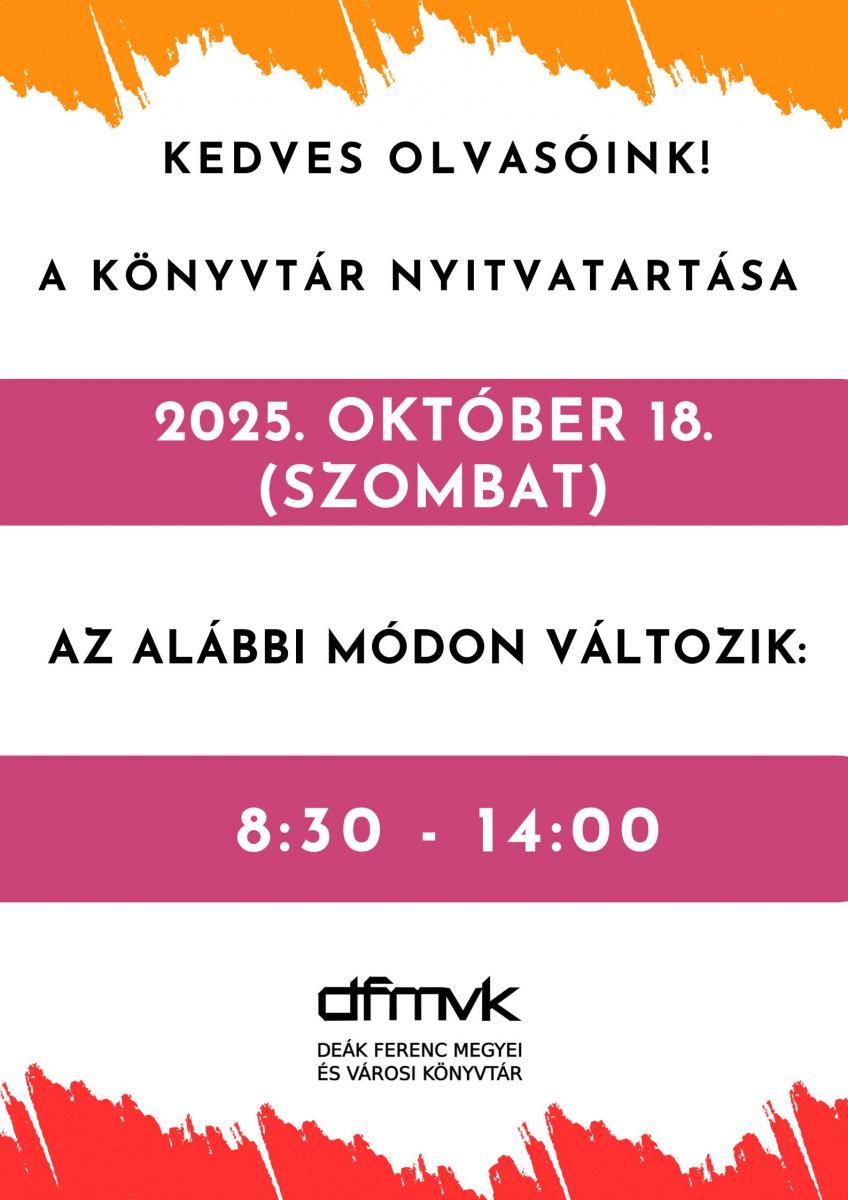 Figyelem! Szombaton tovább lesz nyitva könyvtárunk! Várjuk szeretettel olvasóinkat!