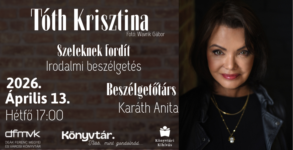 A Deák Ferenc Megyei és Városi Könyvtár vendége Tóth Krisztina, József Attila-díjas író, költő. Az est címe: Szeleknek fordít – irodalmi beszélgetés, amely során a szerző műveiről, alkotói folyamatairól és aktuális köteteiről hallhatunk.