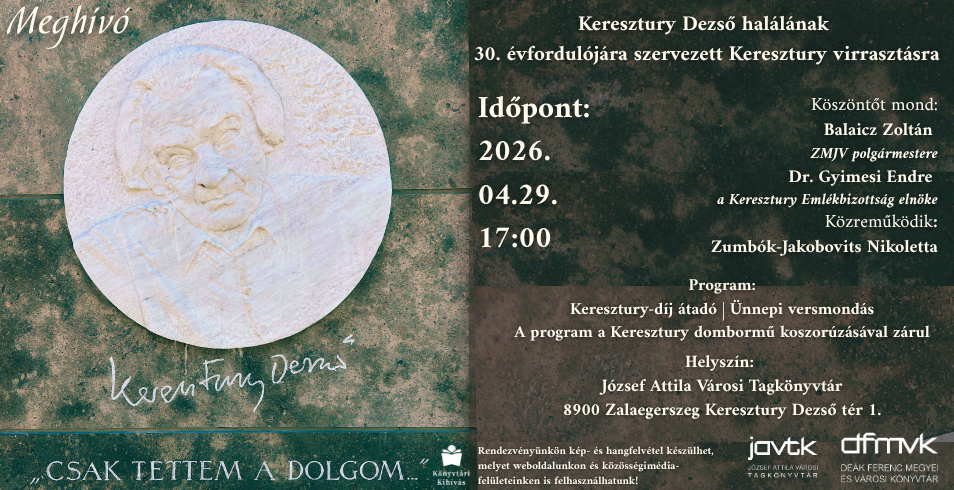 Megemlékezés Keresztury Dezső halálának 30. évfordulóján Zalaegerszegen. Ünnepi műsor, díjátadó és koszorúzás a József Attila Városi Tagkönyvtárban.
