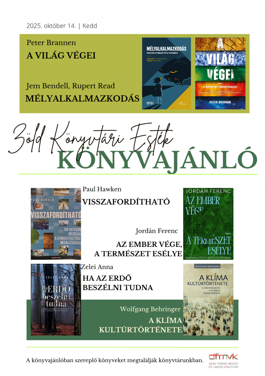 „Zöld könyvtári esték” című programunk izgalmas beszélgetéssel várja az érdeklődőket.